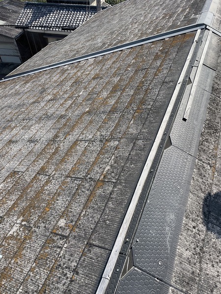 屋根表面に生えた苔やカビは、屋根メンテナンスが必要な証拠。本来スレート屋根表面は塗膜で守られており、カビや苔が生えない環境となっています。しかし、屋根の上という過酷な自然環境に晒され続けることにより、経年劣化で塗膜は劣化してしまうと屋根材がむき出しとなり、水分を吸ってカビや苔がより生えやすくなります。