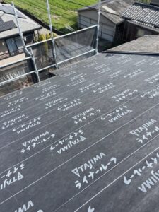 今回は施主様のご要望で、田島の「ニューライナールーフ」を使用いたしました。このニューライナールーフは下葺き材の中でダントツに高いグレードをもつもので、耐久性は30年を誇ります。