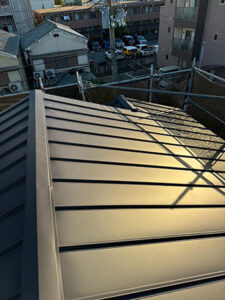 お客様もこれを機会に屋根を軽量化したい、なるべく費用は抑えたいとのご希望でしたので、ガルバリウム鋼板による立平葺きにて施工を行いました。