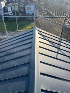 こちらは三回建てで屋根の見た目は重視されていなかったことも立平葺きを選ばれた理由の一つです。お隣との距離が近く、足場を2面のみ設置することで、費用をさらに抑えることができました。