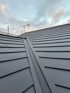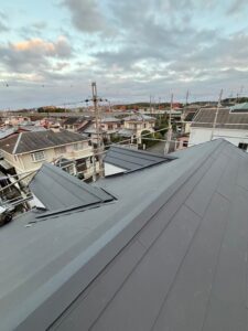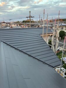 使用した屋根材はスーパーガルテクトのシェイドチャコールです。
