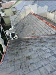 棟の板金は錆びついており、屋根材もカビや苔が繁殖してしまっています。
