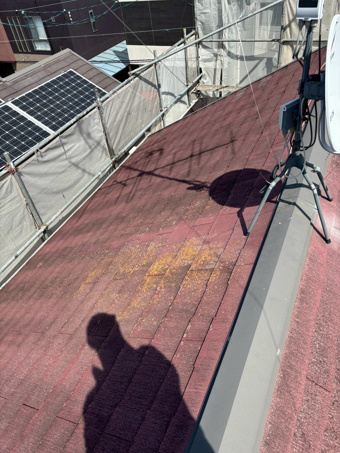 現地で拝見させていただいたところ、使用されていたスレート屋根の劣化がかなり進んでおり、色褪せているうえ、カビが広がっている状態でした。