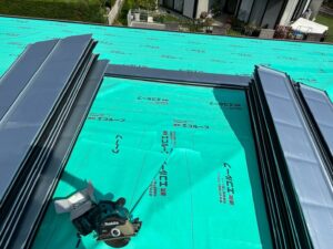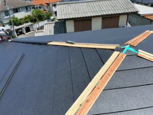 棟板金を外し、屋根材の上からルーフィングシート(防水シート)を張り付けます。