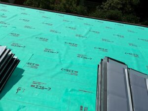 カバー工法は屋根が二重構造になるため、ルーフィングシートには通気性に優れたエコルーフを採用いたしました。